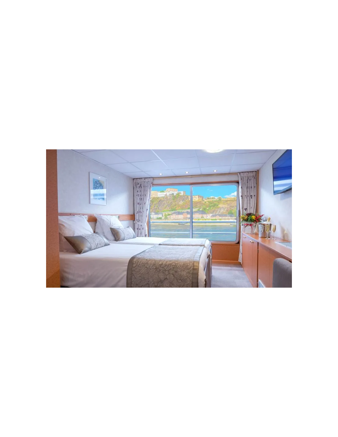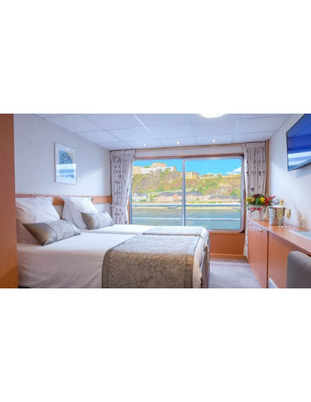 Cabine spacieuse et confortable disposant de deux lits séparables, avec une salle d'eau (lavabo, douche et toilettes privées, serviettes fournies), sèche-cheveux, télévision, coffre-fort et radio.